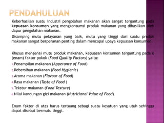 Keberhasilan industri pengolahan makanan bergantung pada kepuasan konsumen yang dipengaruhi oleh enam faktor mutu produk, termasuk penampilan, kebersihan, aroma, rasa, tekstur, dan nilai gizi. Mutu produk juga dipengaruhi oleh kualitas bahan baku, keahlian juru masak, peralatan dapur, dan penggunaan resep baku. Struktur organisasi dapur bervariasi berdasarkan ukuran dan jenis perusahaan, dengan peran chef yang mencakup manajemen dapur, pengelolaan budget, dan pengawasan kegiatan operasional.