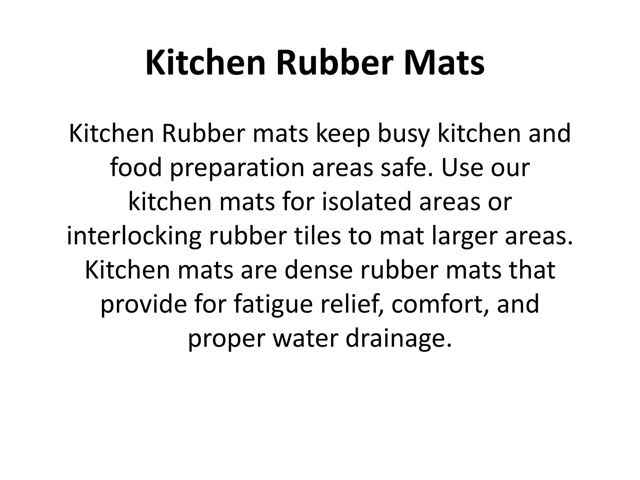 Kitchen rubber mats ensure safety in food preparation areas by providing comfort and fatigue relief. They are designed to prevent slipping on grease and moisture while allowing for proper water drainage. A variety of mats and interlocking tiles are available for different kitchen layouts.