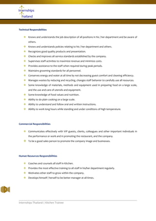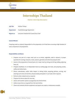 The document describes a kitchen trainee internship position in Thailand. As a kitchen trainee, responsibilities would include preparing meals as ordered by following recipes and ensuring high quality of taste, temperature, and preparation. Specific duties are preparing portions of major meals like entrees and desserts, assisting with meal preparation, and preparing breakfast items independently. Additional responsibilities are cleaning and maintaining kitchen equipment, following food safety and sanitation standards, and assisting other kitchen staff as needed. The goal of the position is to gain experience in commercial kitchen operations and food preparation.