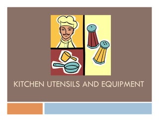 This document provides an overview of common kitchen utensils and equipment, describing 47 different items. It explains that while thousands of gadgets exist, most are variations of basic utensils like knives, forks and spoons. Specialized utensils make tasks more convenient by making food preparation faster and easier. The document then describes each utensil pictured, providing its name, function, and examples of how it is used. It emphasizes learning the proper utensils helps make cooking more efficient.
