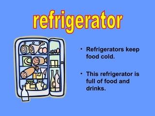 This document describes various kitchen appliances and utensils including refrigerators, stoves, microwaves, coffee makers, toasters, blenders, plates, cups, silverware, cutting boards, and knives; it notes what each item is used for and some of their key features.