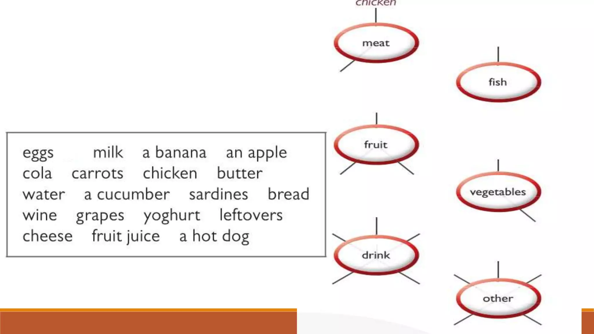 Questions about common items in a fridge, such as milk, oranges, apples, and typical purchases.