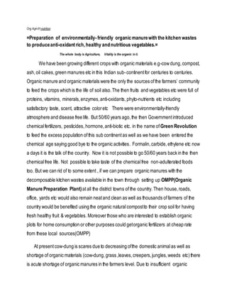 The document emphasizes the importance of preparing organic manure using kitchen waste to promote healthy soil and nutritious crops, highlighting the detrimental effects of chemical fertilizers introduced in the past. It advocates for establishing Organic Manure Preparation Plants (OMPP) to utilize urban waste and address the growing shortage of organic materials in agriculture. By doing so, the initiative aims to improve soil health, crop quality, and overall human nutrition, while advocating for sustainable agricultural practices in Bangladesh.