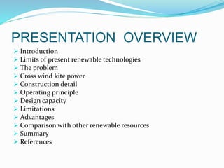 The document discusses energy kites as an innovative approach to renewable wind energy, highlighting their advantages over traditional wind turbines such as lower costs and increased efficiency. Crosswind kite systems utilize kites tethered to the ground to harvest high-altitude winds, with significant potential for electricity generation. Implementing energy kite technology on a large scale could reduce reliance on conventional power sources and help combat global warming.