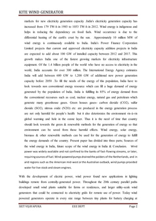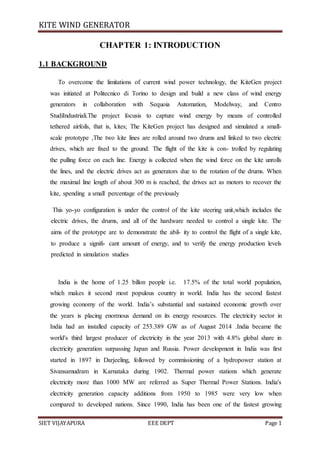 This document describes a kite wind generator system. The kite wind generator project was initiated to design a new class of wind energy generators using controlled tethered kites. A small-scale prototype was designed and simulated. It uses two kite lines wound around drums connected to electric drives fixed to the ground. The kite flight is controlled by regulating the pulling force on each line. When the wind unrolls the lines, the electric drives generate electricity. When the 300m line length is reached, the drives recover the kite. The prototype aims to demonstrate single kite control and significant energy production validated by simulations.