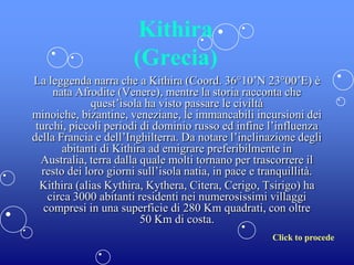 Kithira, un'isola greca, è legata alla leggenda della nascita di Afrodite e ha vissuto l'influenza di diverse civiltà storiche. Gli abitanti tendono a emigrare in Australia, ma molti tornano per vivere in serenità nella loro terra natale. Kithira ha circa 3000 residenti distribuiti in numerosi villaggi su un'area di 280 km² con oltre 50 km di costa.