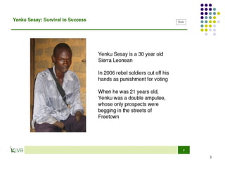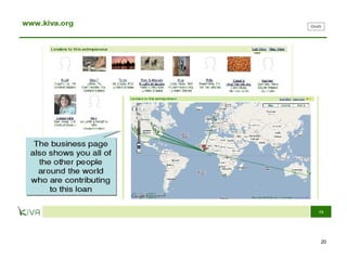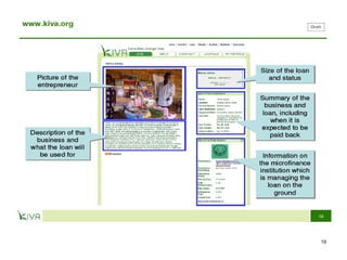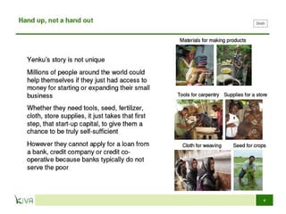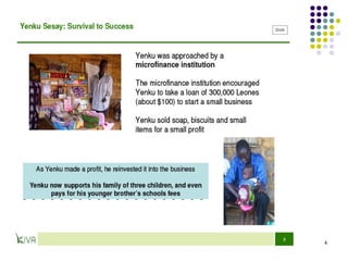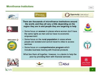 Microfinance provides small loans, savings opportunities, and other financial services to low-income individuals who lack access to traditional banking. Muhammad Yunus founded Grameen Bank in 1983 to provide credit to the poor in Bangladesh without requiring collateral. Grameen Bank and microcredit more broadly have helped millions of people rise out of poverty by allowing them to start small businesses. While microcredit has significantly benefited many, concerns remain regarding interest rates and whether loans truly benefit women. Microfinance continues expanding to help alleviate global poverty.