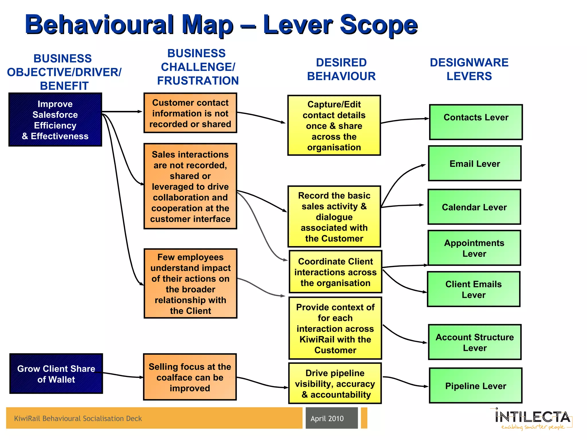 This document introduces new practices and behaviors for improving customer relationship management (CRM) at KiwiRail. It outlines desired behaviors such as capturing contact details once and sharing them across the organization. It also discusses levers for improving salesforce efficiency like recording basic sales activities and appointments in a calendar. The goal is to drive pipeline visibility, accuracy and accountability. It proposes seamless contact and appointment management between the CRM system and Outlook to make CRM work the way users currently work and take information wherever needed.