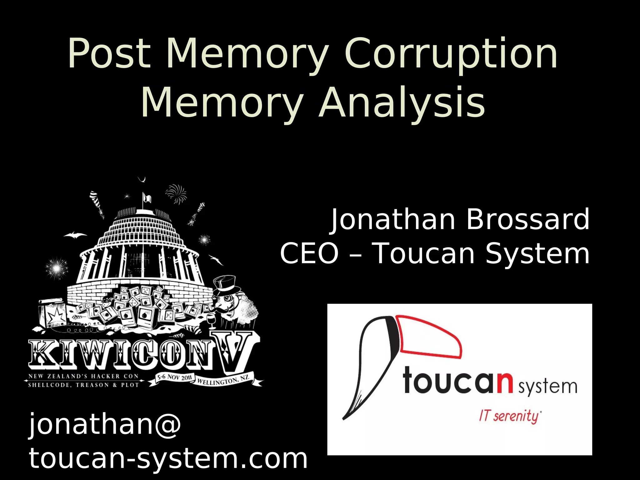 The document discusses the PMCMA (Post Memory Corruption Memory Analysis) tool, designed for debugging and exploitation analysis in Linux environments, primarily focusing on memory corruption vulnerabilities. It details how PMCMA can analyze applications for invalid memory accesses, various exploitation techniques, and testing strategies to mitigate security risks such as ASLR (Address Space Layout Randomization). Additionally, it outlines specific scenarios and shellcode methodologies for executing and managing processes effectively during memory exploitation attempts.