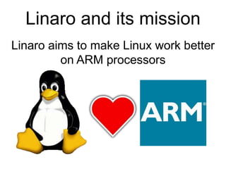 Linaro aims to improve Linux support for ARM processors. They created LAVA (Linaro Automated Validation) to automate testing of new kernels on ARM hardware. LAVA needs a way to trigger test runs when kernel builds finish. Linaro implemented an XML-RPC API with HTTPS and token-based authentication to securely allow remote triggering of test runs. They open sourced the server and client code to make it easy for others to add authenticated XML-RPC to projects.