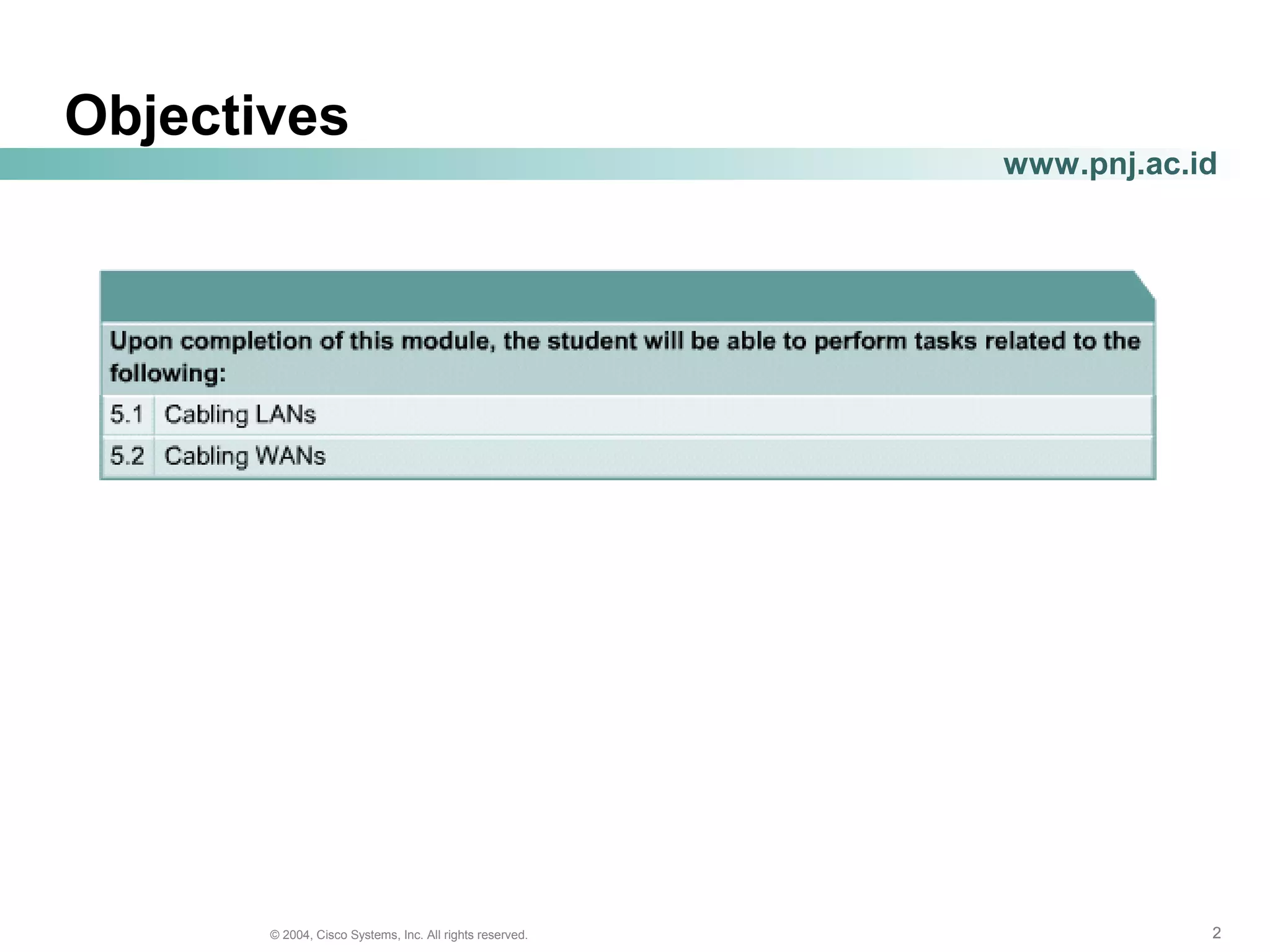 This document discusses cabling for LANs and WANs. It covers topics like Ethernet cabling and connectors used in campus networks, the use of UTP cable for implementing Ethernet, and networking devices like repeaters, hubs, bridges, and switches. The document also discusses WAN connectivity using serial connections, ISDN, DSL, and the role of routers in providing connectivity within the LAN and to the WAN.