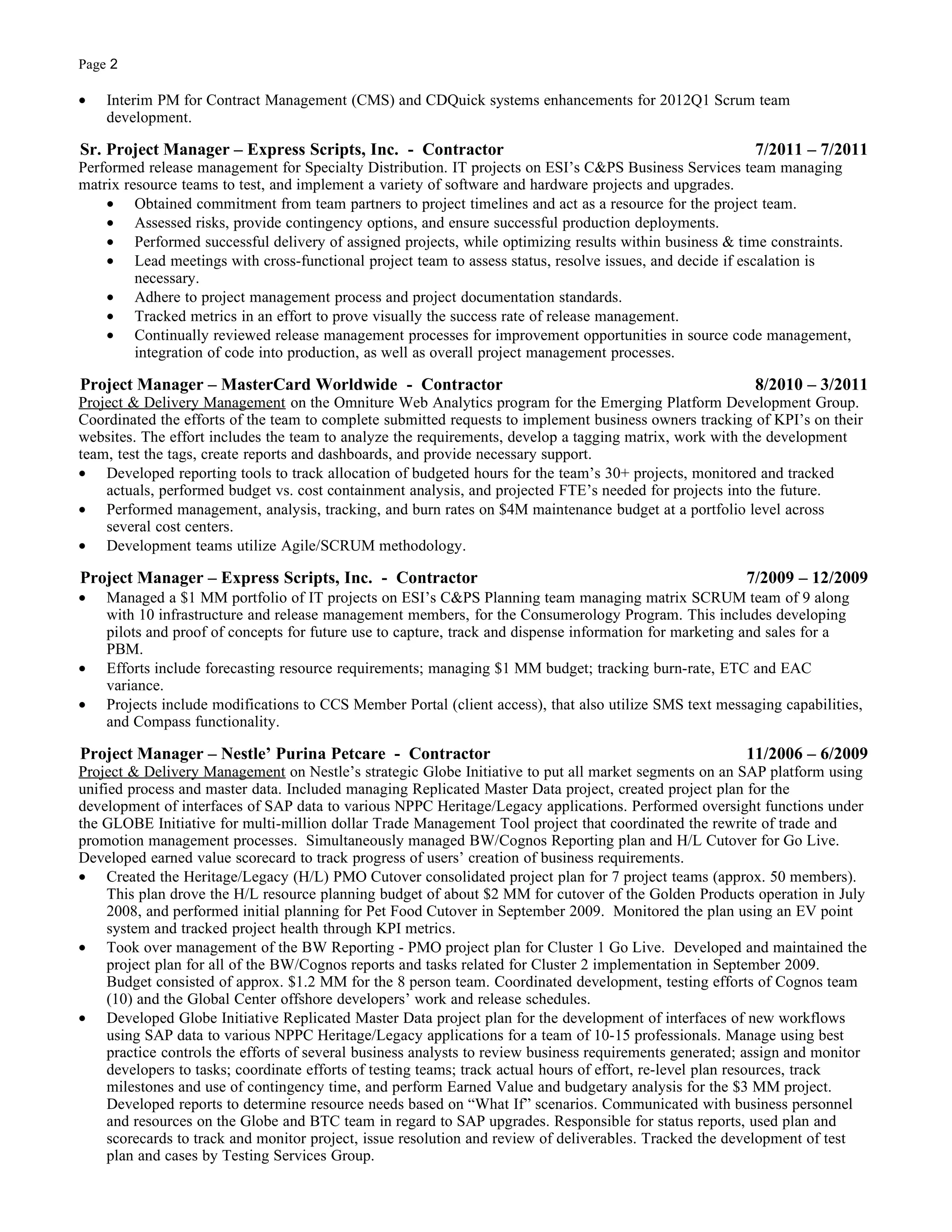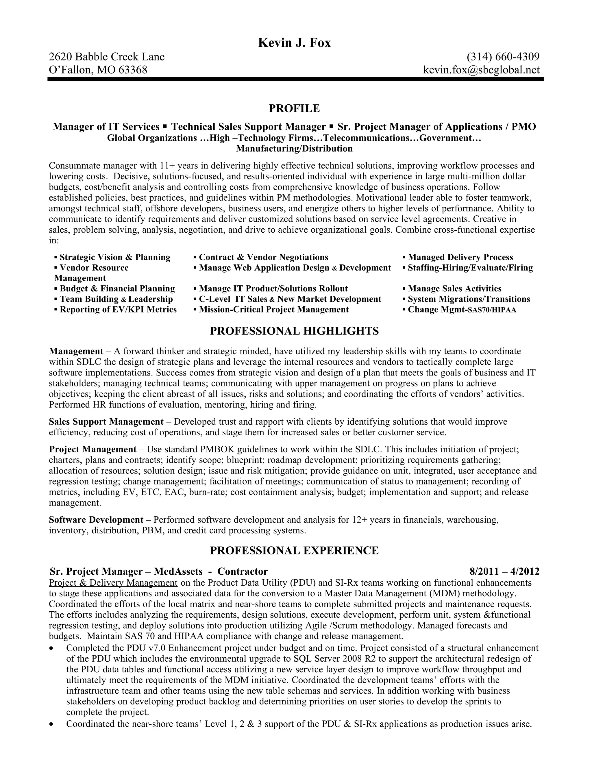This resume is for Kevin J. Fox, an experienced Project Manager and IT professional with over 11 years of experience managing technical projects and teams. He has a proven track record of successfully delivering large, multi-million dollar projects on time and under budget across various industries. He possesses strong leadership, communication, budgeting, and project management skills.