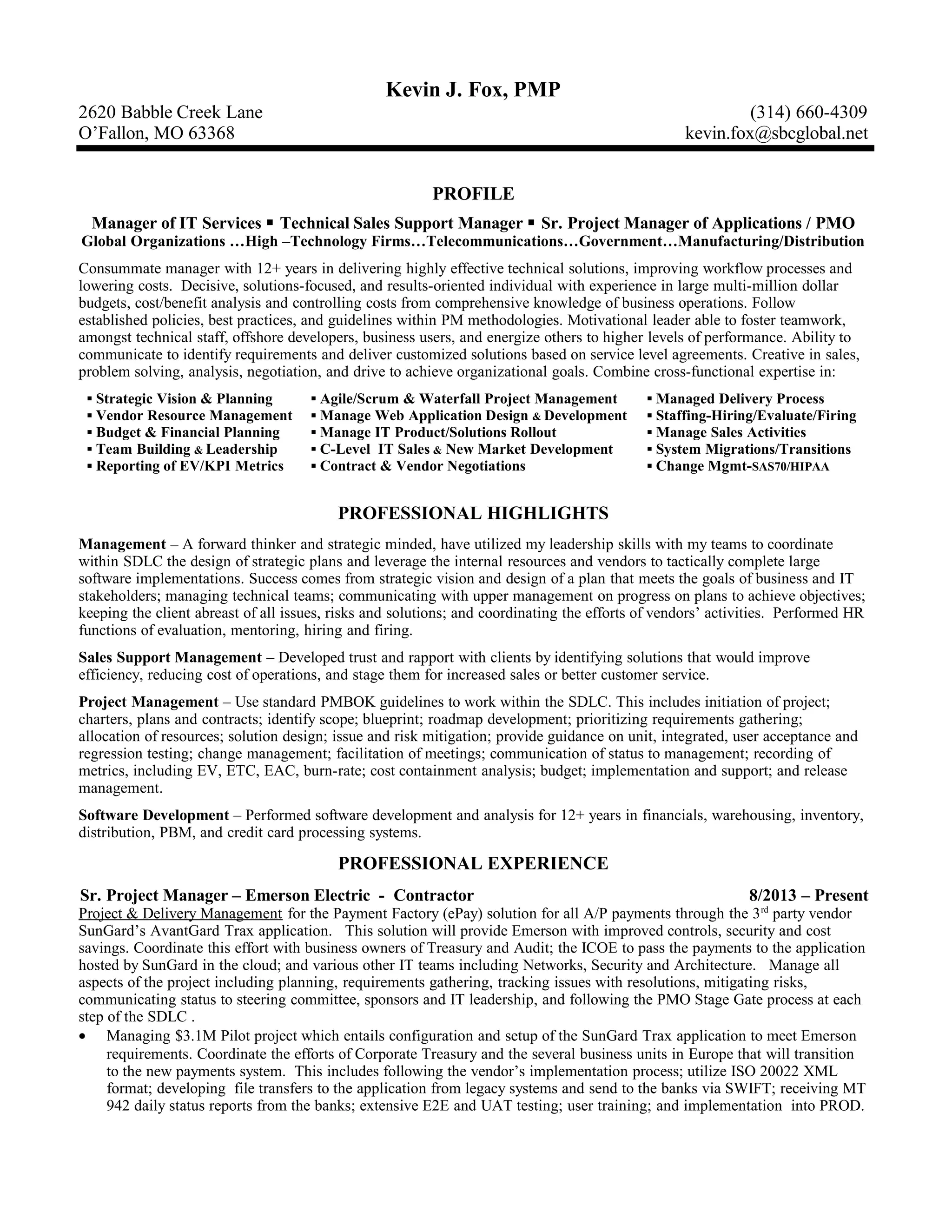 The document provides a summary of Kevin J. Fox's experience as a project manager, sales support manager, and IT services manager over 12+ years. He has experience managing multi-million dollar budgets and teams across various industries. His experience includes strategic planning, project management, vendor management, sales support, and managing software development teams using Agile and Waterfall methodologies. His background includes roles at Emerson Electric, Centene, MedAssets, Express Scripts, MasterCard, and other global organizations.