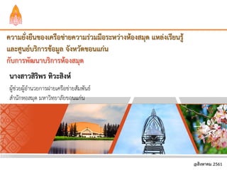 การพัฒนาเครือข่ายห้องสมุดและแหล่งบริการสารสนเทศ 11 แห่ง ในจังหวัดขอนแก่น เริ่มก่อตั้งมาตั้งแต่ปี 2556 เป็นต้นมา