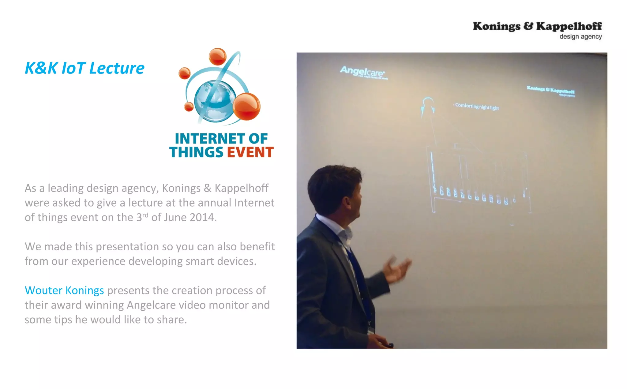 Konings & Kappelhoff presented at the Internet of Things event in June 2014, showcasing their experience in developing smart devices, including the award-winning Angelcare video monitor. They emphasized the importance of project management, innovation in development, and user scenario testing while providing insights into their design process and collaborations with various partners. The document includes design tips and examples of their smart product portfolio, outlining their strategic approach to industrial design and client involvement.