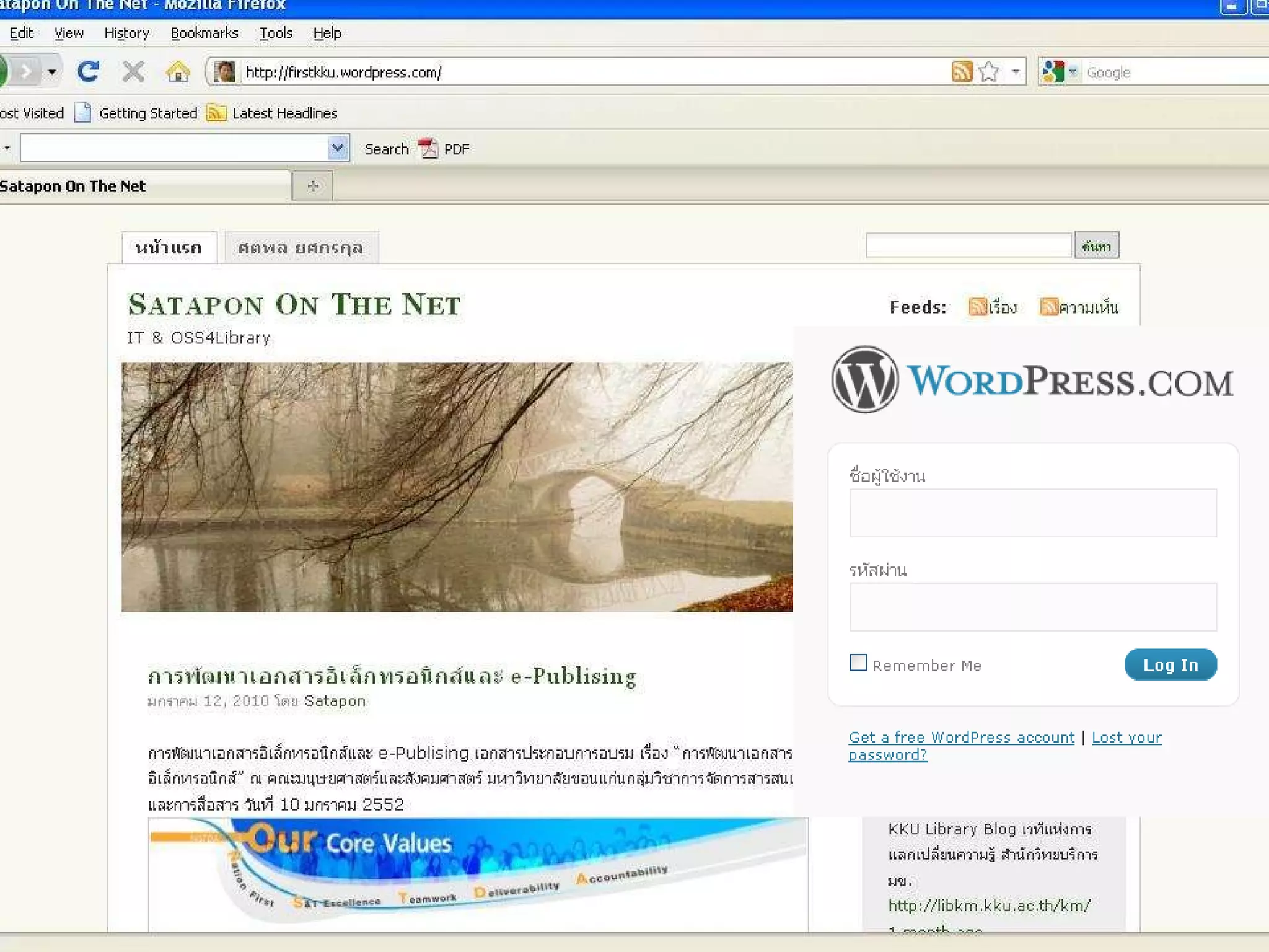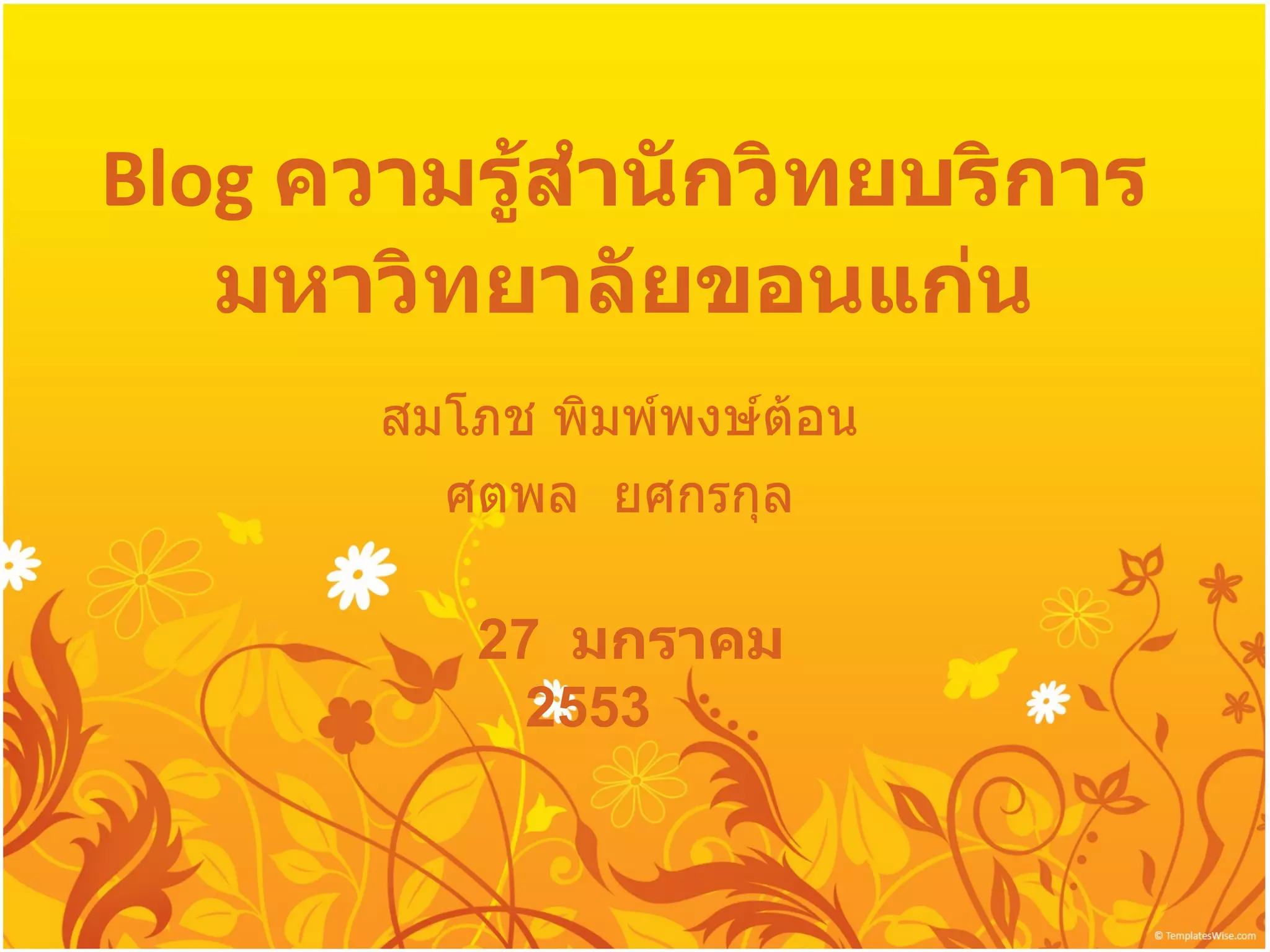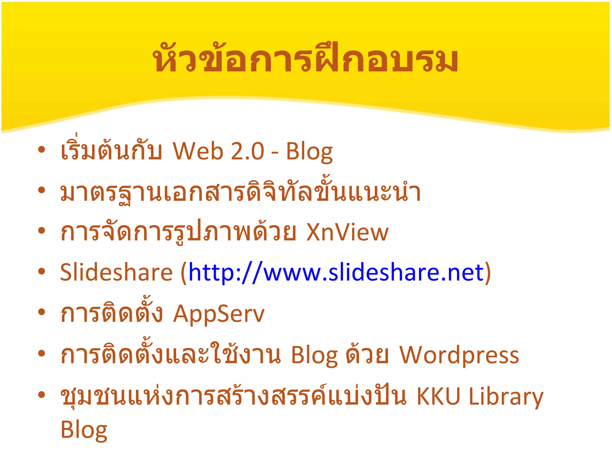 Kkulibrary Blog 1. 2. หัวข้อการฝึกอบรม เริ่มต้นกับ Web 2.0 - Blog มาตรฐานเอกสารดิจิทัลขั้นแนะนำ การจัดการรูปภาพด้วย XnView Slideshare ( http://www.slideshare.net ) การติดตั้ง AppServ การติดตั้งและใช้งาน Blog ด้วย Wordpress ชุมชนแห่งการสร้างสรรค์แบ่งปัน KKU Library Blog 3. เริ่มต้นกับ Web 2.0 - Blog Blog == Web Log Blog เว็บความร่วมมือที่ง่าย ไม่ซับซ้อน เครื่องมือเชื่อมความสัมพันธ์ระหว่างบุคคลได้เป็นอย่างดี สื่อสารได้ง่าย ทันใจ อนุทินชีวิต / การงานฉบับออนไลน์ จุดเด่นเรื่องหมวดเนื้อหาและ Tag 4. Web 2.0 ก้าวสำคัญของ Library 2.0 การสร้างช่องทางความร่วมมือด้วย ICT ที่เหมาะสมตามแนวคิด Web 2.0 Web 2.0 Tim O'Reilly Web as platform Read/write Perpetual beta Library 2.x Librarycrunch.com User participation User-centred services Radical trust 5. เริ่มต้นกับ Web 2.0 - Blog Blog == Web Log Blog เว็บความร่วมมือที่ง่าย ไม่ซับซ้อน เครื่องมือเชื่อมความสัมพันธ์ระหว่างบุคคลได้เป็นอย่างดี สื่อสารได้ง่าย ทันใจ อนุทินชีวิต / การงานฉบับออนไลน์ จุดเด่นเรื่องหมวดเนื้อหาและ Tag 6. 7. เริ่มต้นกับ Web 2.0 - Blog Free Services http://www.wordpress.com http://www.blog.com http://gotoknow.org Free Software http://www.wordpress.org 8. 9. 10. 11. 12. 13. 14. 15. 16. 17. 18. 19. 20. ตัวอย่างการตั้งชื่อสื่อนำเสนอด้วย Microsoft PowerPoint ตั้งชื่อแฟ้มเอกสารในฟอร์แมต yyyymmdd-filename.ppt โดย yyyy คือ ปี ค . ศ . mm คือตัวเลขเดือน dd คือเลขวัน ภาษาอังกฤษ ผสมตัวเลข ห้ามเว้นวรรค ใช้ได้เฉพาะเครื่องหมาย – 21. 22. 23. 24.