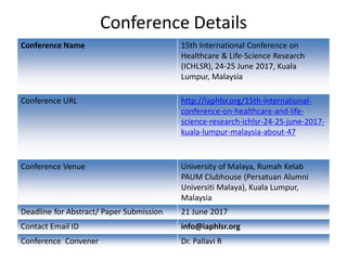 The document provides information about the 15th International Conference on Healthcare & Life-Science Research (ICHLSR) that will take place on June 24-25, 2017 in Kuala Lumpur, Malaysia. It includes details about the conference themes, registration fees, accommodation options, publication opportunities, venue, and how to submit abstracts/papers. The conference is organized by the International Association for Promotion of Healthcare and Life-Science Research (IAPHLSR) to bring together researchers and professionals in the fields of healthcare and life sciences.