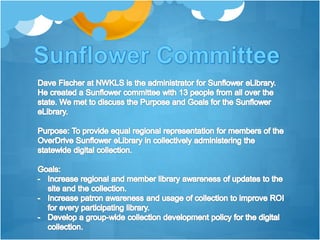 The document provides information about various resources and services offered by the Central Kansas Library System, including the Sunflower eLibrary and OverDrive. It highlights features like the Libby app for managing digital books and the library's digital dashboard for tracking reading trends. Additionally, it shares links for further resources and support for librarians.