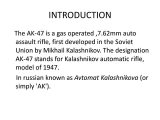 The AK-47 is a gas-operated 7.62mm assault rifle developed in the Soviet Union by Mikhail Kalashnikov and adopted in 1949. Over 100 million AK-47s have been produced, making it the most widely used rifle in the world. It features a simple design, is inexpensive to produce, easy to use and maintain, and is highly reliable even in harsh conditions. The AK-47 fires the 7.62x39mm round with an effective range of 300 meters fully automatic or 400 meters semi-automatic. It remains in service with militaries and has been manufactured in many countries due to its low production cost and ease of use.