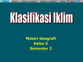 Dokumen tersebut membahas klasifikasi iklim menurut beberapa pakar seperti Koppen, Schmidt-Ferguson, Oldeman, dan Junghuhn. Klasifikasi iklim Koppen membagi iklim berdasarkan curah hujan dan temperatur menjadi lima tipe. Klasifikasi Schmidt-Ferguson membagi berdasarkan rasio curah hujan bulan basah dan kering. Klasifikasi Oldeman berdasarkan frekuensi bulan basah berturut-turut. Klasifikasi Junghuhn berdasarkan