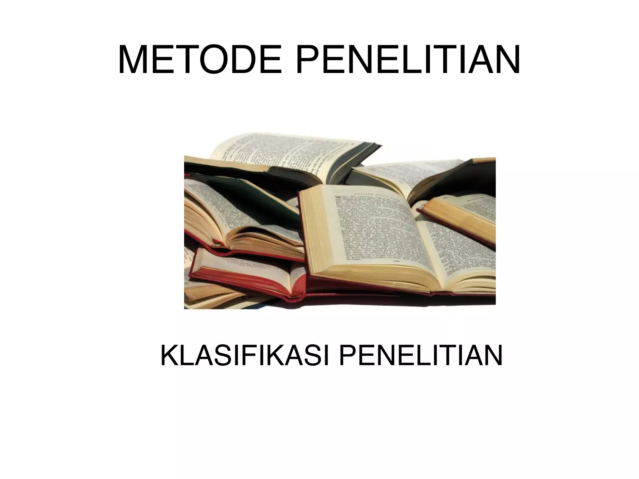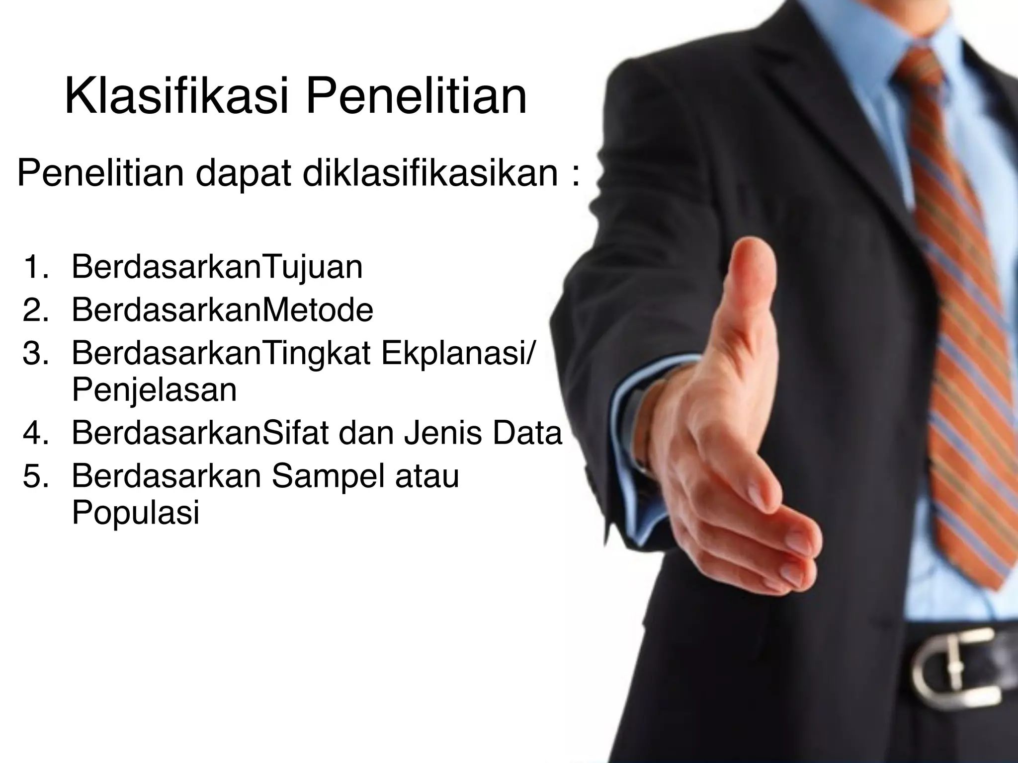 Dokumen tersebut membahas tentang klasifikasi penelitian yang dapat dibedakan berdasarkan tujuan, metode, tingkat ekplanasi, sifat dan jenis data, serta penggunaan sampel atau populasi. Ada beberapa jenis penelitian seperti penelitian dasar, terapan, evaluasi, eksperimen, survei, sejarah, dan studi kasus.