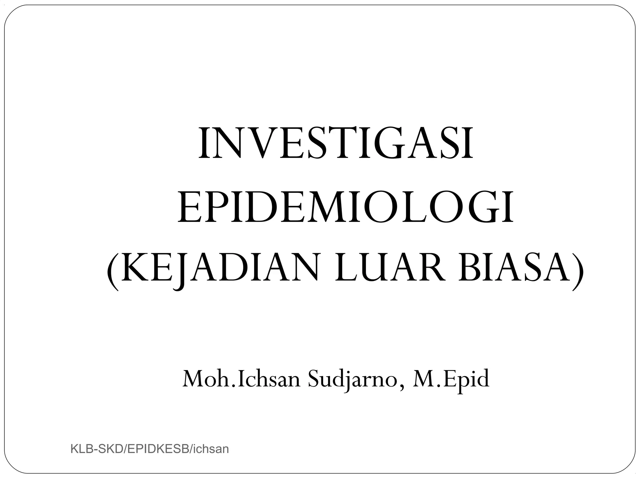 Dokumen ini menjelaskan tentang kejadian luar biasa (KLB) dalam konteks epidemiologi, termasuk definisi, kriteria penetapan, proses pelaksanaan, serta strategi pengendalian KLB. Peringatan dini dan deteksi dini juga diuraikan sebagai langkah preventif untuk mengantisipasi peningkatan kejadian kesakitan. Jenis-jenis KLB dan prosedur penyelidikan epidemiologik yang diperlukan untuk mengatasi masalah kesehatan masyarakat juga dibahas.