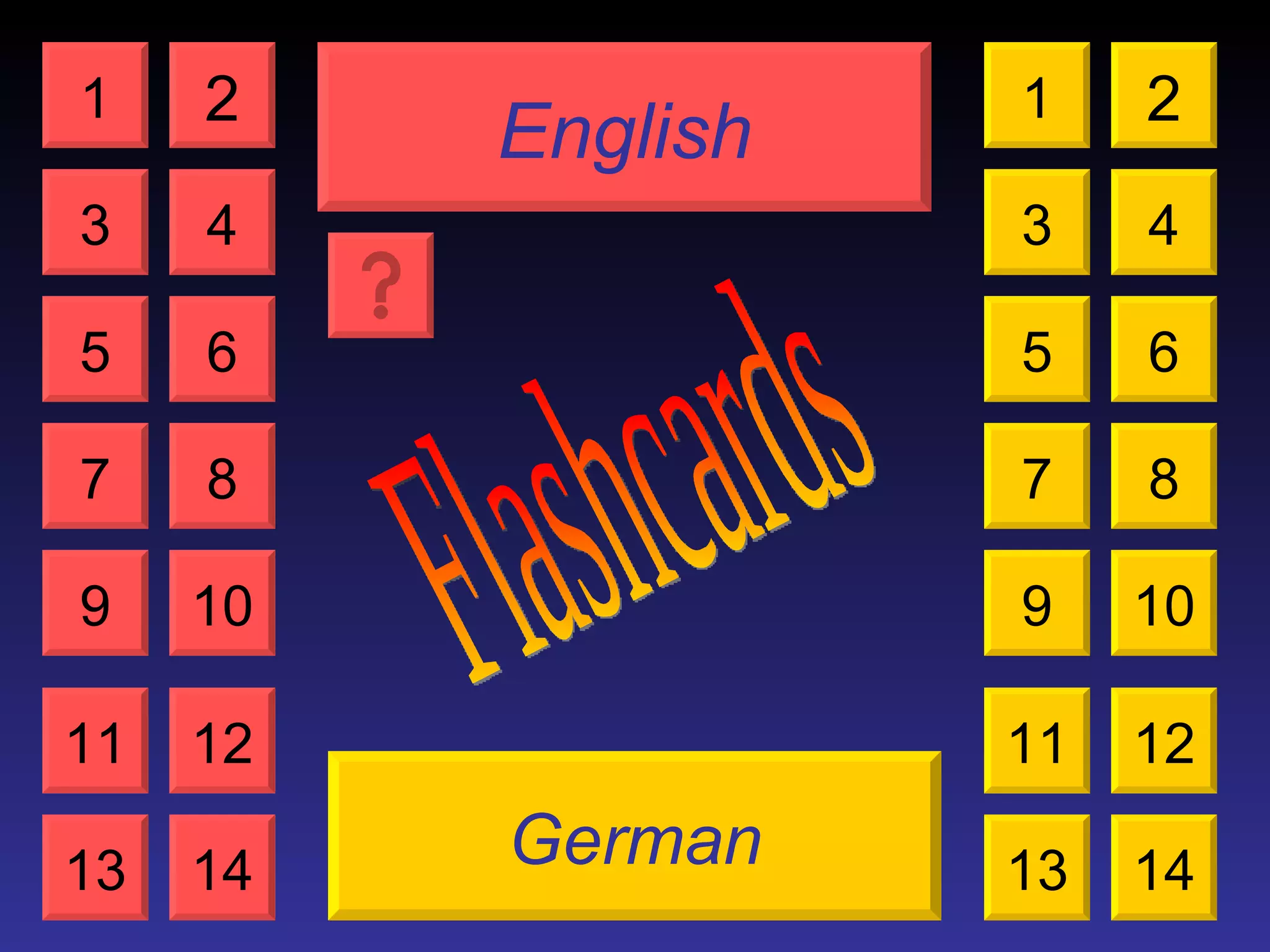 This document appears to be a set of German-English flashcards containing clothing vocabulary words. There are 14 flashcards that show an English or picture term on one side and the German translation on the flip side. The flashcards can be navigated through using control buttons to flip between the front and back or move through the deck.