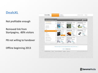 1. Several projects from 2012 were discontinued or handed over to other teams, including DealsXL which saw a large drop in visitors and PB was unwilling to transfer ownership, and Weekmenu which was transferred to the Food Team.