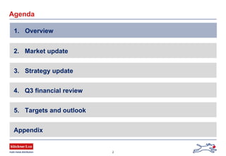 This document provides an overview and update from the CFO of Klöckner & Co SE, a leading steel and metals distributor. It summarizes Klöckner's financial performance in Q3 2008, confirms a record result for 2008 despite a weak economic outlook. It also outlines Klöckner's strategy update, including cost cutting measures in response to the economic slowdown, and adjustments to its financial targets and outlook for 2008 with sales expected to be slightly below €7 billion.