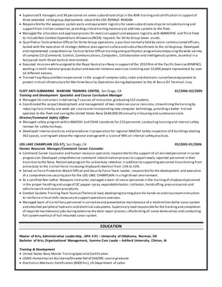 This document summarizes the experience and qualifications of Thomas J. Kluwin, including over 15 years of experience in leadership roles in the Navy, managing teams and providing critical defense training. He has extensive experience developing training programs and curriculum, managing complex operations and projects, and cultivating relationships both within the Navy and with international partners. Currently he serves as an instructional development specialist providing anti-submarine warfare training to over 650 personnel around the world.