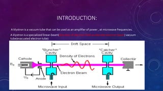 The document summarizes the construction and working of a klystron, which is a vacuum tube that can amplify power at microwave frequencies. It consists of an electron gun, cathode, collector, focusing anodes, two cavities (buncher and catcher), and a drift space. Electrons are emitted from the cathode and pass through the buncher cavity where they become velocity modulated. In the drift space, the electrons interact with the RF signal and become bunched. The electron bunches then pass through the catcher cavity where they produce an amplified output RF signal that is extracted. The klystron is thus able to amplify an input microwave signal through the velocity modulation and bunching of electrons using the cavities and drift space