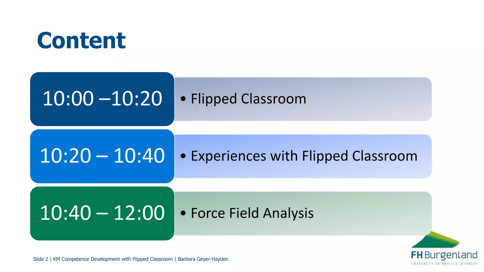 The document discusses the implementation and benefits of the flipped classroom model in the master's program of Applied Knowledge Management at the University of Applied Sciences Burgenland. It emphasizes the importance of integrating face-to-face and online learning to enhance student competence development while providing strategies for the blended learning approach. The document highlights positive aspects of the flipped classroom, such as flexibility and learner-centeredness, while also addressing challenges faced by both students and lecturers in adopting this method.