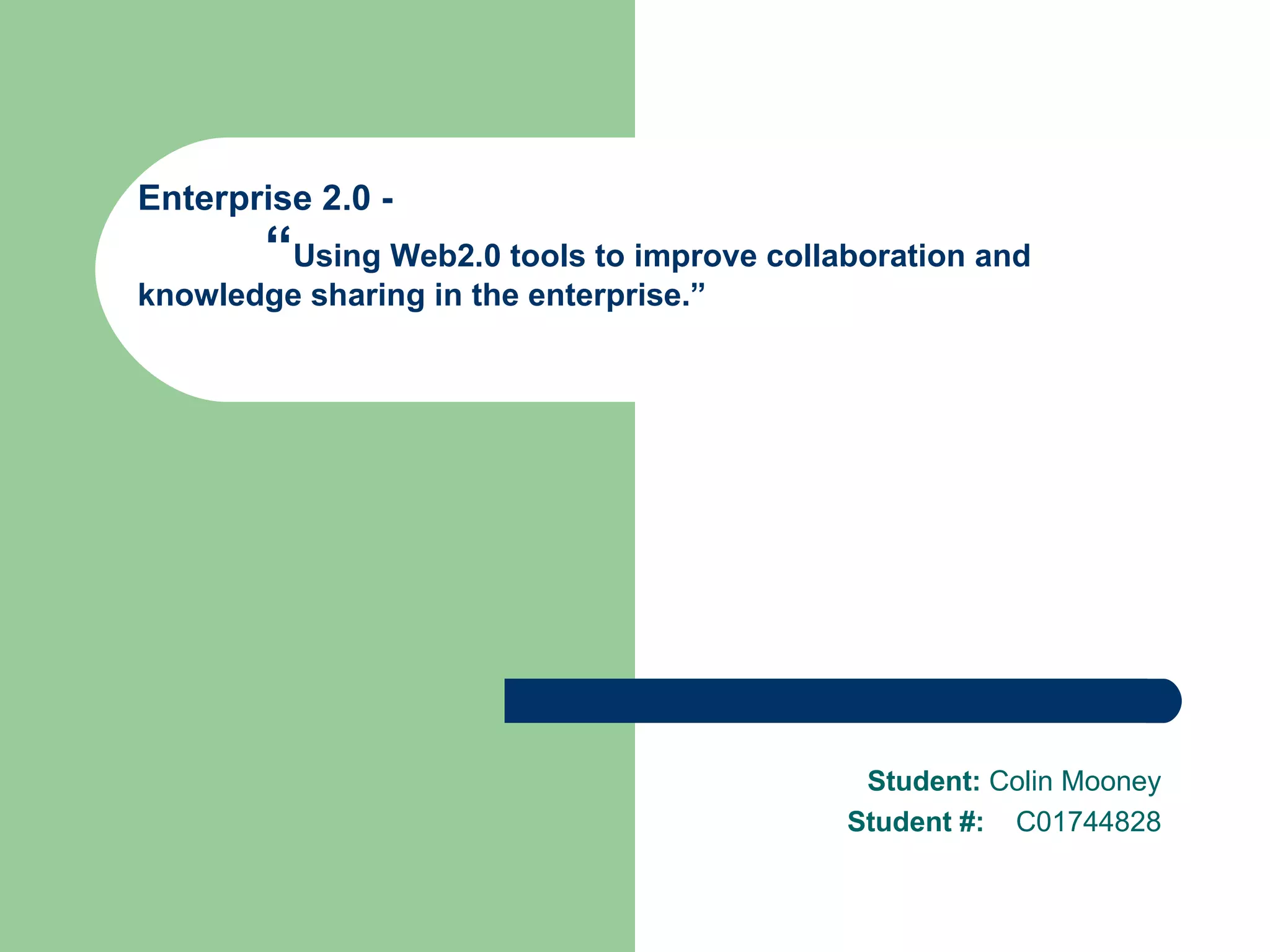 The document outlines a dissertation project by Colin Mooney focused on utilizing Web 2.0 tools to enhance collaboration and knowledge sharing within enterprises. It discusses the concepts of Web 2.0 and Enterprise 2.0, the importance of knowledge management, and aims to explore successes and failures through case studies and interviews with senior managers. The project will also include a literature review and the creation of a dissertation wiki to facilitate collaboration.