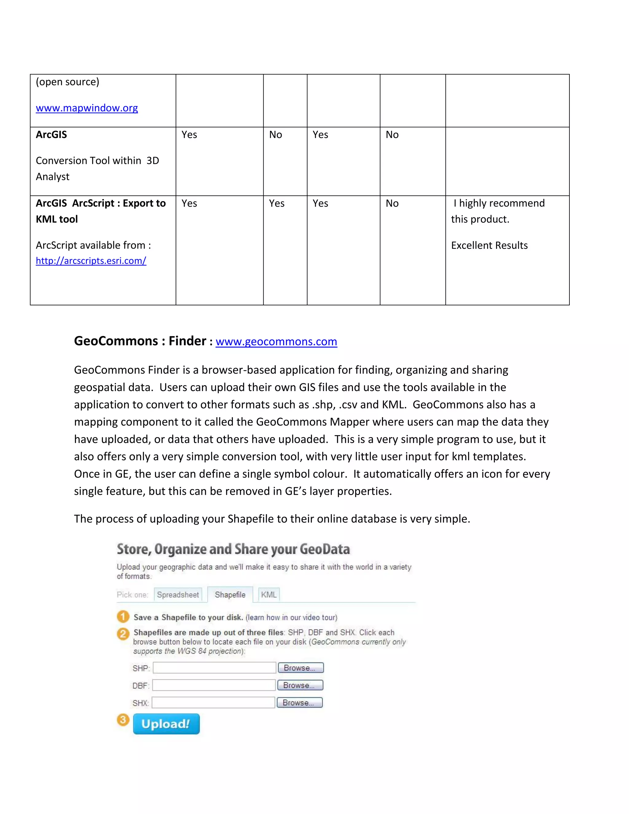 The document summarizes and compares several tools for converting Shapefiles to KML format for use in Google Earth. GeoCommons Finder allows simple online conversion but offers limited customization. Shp2kml is highly recommended as it allows unique and graduated symbology, labels, customized balloons, and projects coordinate systems. Google Earth Pro and ArcGIS conversion tools support symbology and attribute transfer but not labels. Shp2earth allows labels and attribute transfer but not advanced symbology, while the ArcGIS KML export script supports all features including timeline functionality. Overall the tools vary in supported features from simple to full-featured conversions.