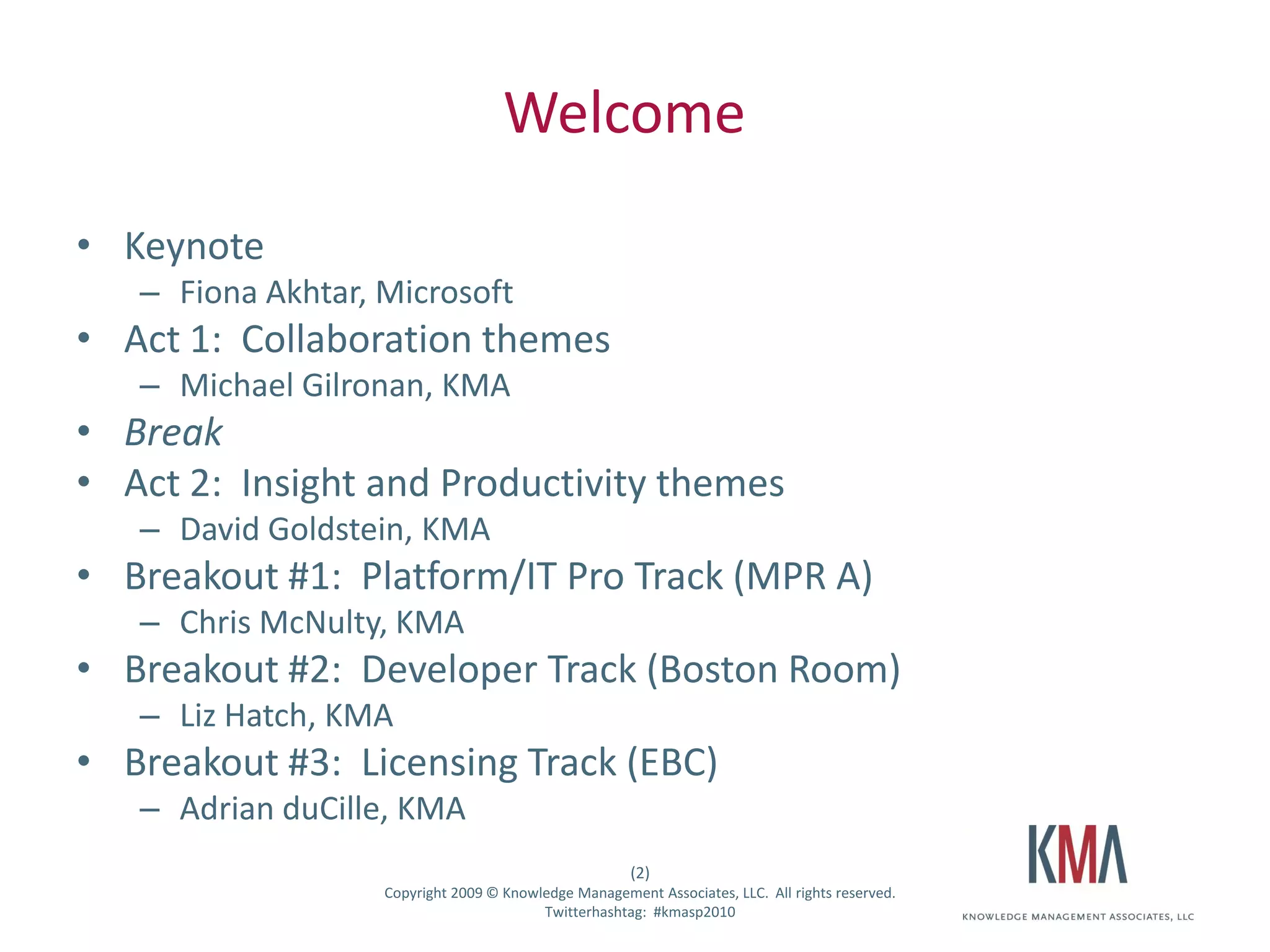 - Two acts with various themes and presentations, including on collaboration, insight and productivity tools in SharePoint 2010.