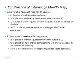 A Karnaugh map is a graphical representation of a logic system that can be used to minimize sum-of-products or product-of-sums Boolean expressions. It works by plotting the minterms or maxterms of a function onto a grid whose dimensions correspond to the number of variables. Ones are placed in the cells that correspond to true minterms or false maxterms, while don't cares are marked with Xs. By grouping adjacent ones, the Karnaugh map allows identifying logical patterns to minimize the expression into prime implicants. The document provides examples of two, three, and four variable Karnaugh maps and discusses their use case for minimization.