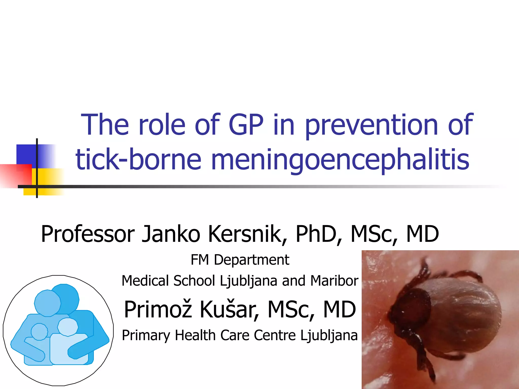 The document discusses the role of general practitioners (GPs) in preventing tick-borne meningoencephalitis. It notes that tick-borne diseases are endemic in Slovenia, with 153-532 new cases per year. While there is no specific treatment, vaccination can be effective. However, Slovenia's vaccination rate is only 10%, much lower than Austria's rate of 86-90%. The document argues that GPs can play an important role in prevention through advising on and offering immunization to patients. It concludes that GPs need to understand vaccination schedules and keep accurate immunization records.