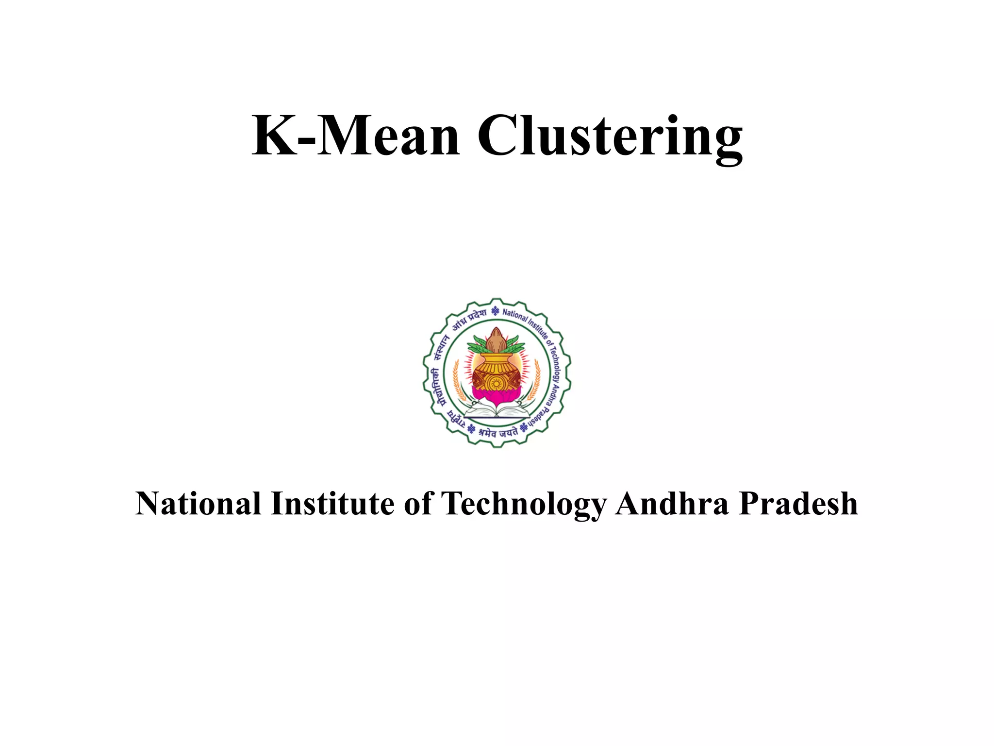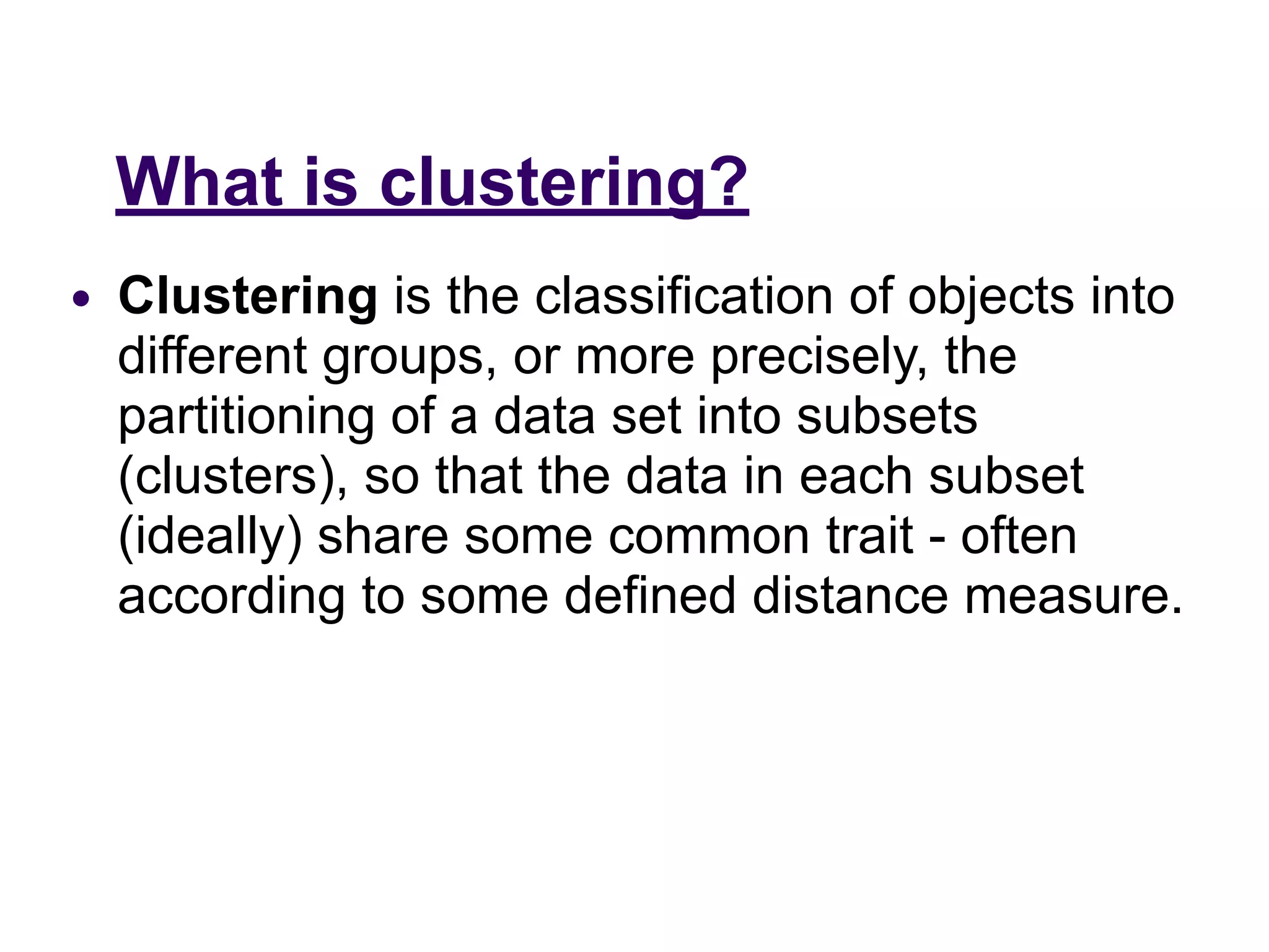 The document provides an overview of k-means clustering, a method for partitioning a data set into k distinct groups based on similarity measures, particularly the Euclidean distance. It outlines the algorithm's steps, its sensitivity to initial conditions, and its applications in areas such as machine learning and image segmentation. Additionally, it discusses the limitations of k-means clustering, including dependency on initial groupings and varying results with different data orders.