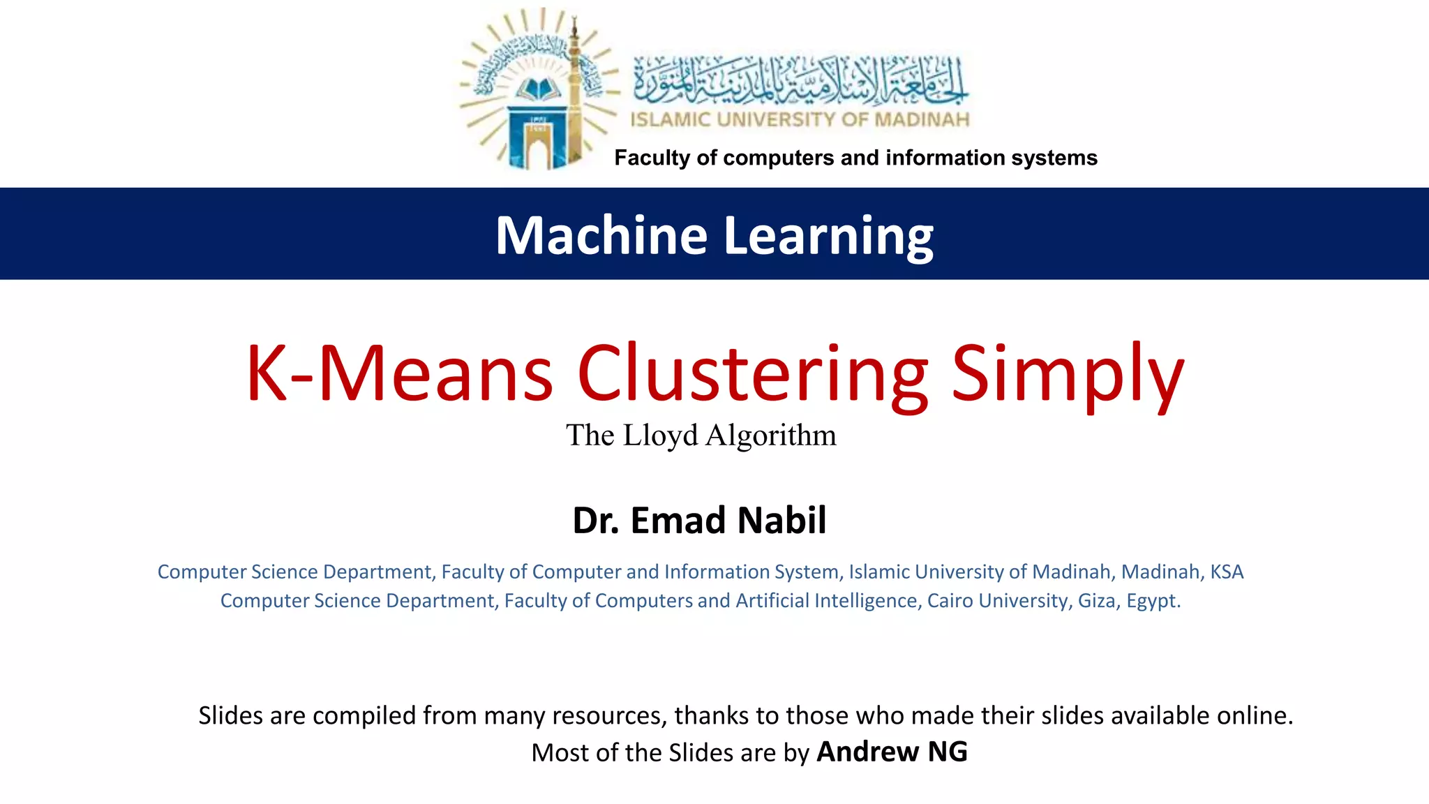 This document discusses machine learning and K-means clustering. It provides an overview of the K-means algorithm, including random initialization of clusters, cluster assignment and moving centroid steps. It also discusses choosing the number of clusters, evaluating and visualizing K-means clustering, and some applications of clustering like image analysis and market segmentation. The document is attributed to Andrew Ng and references his lecture slides on machine learning and K-means clustering.