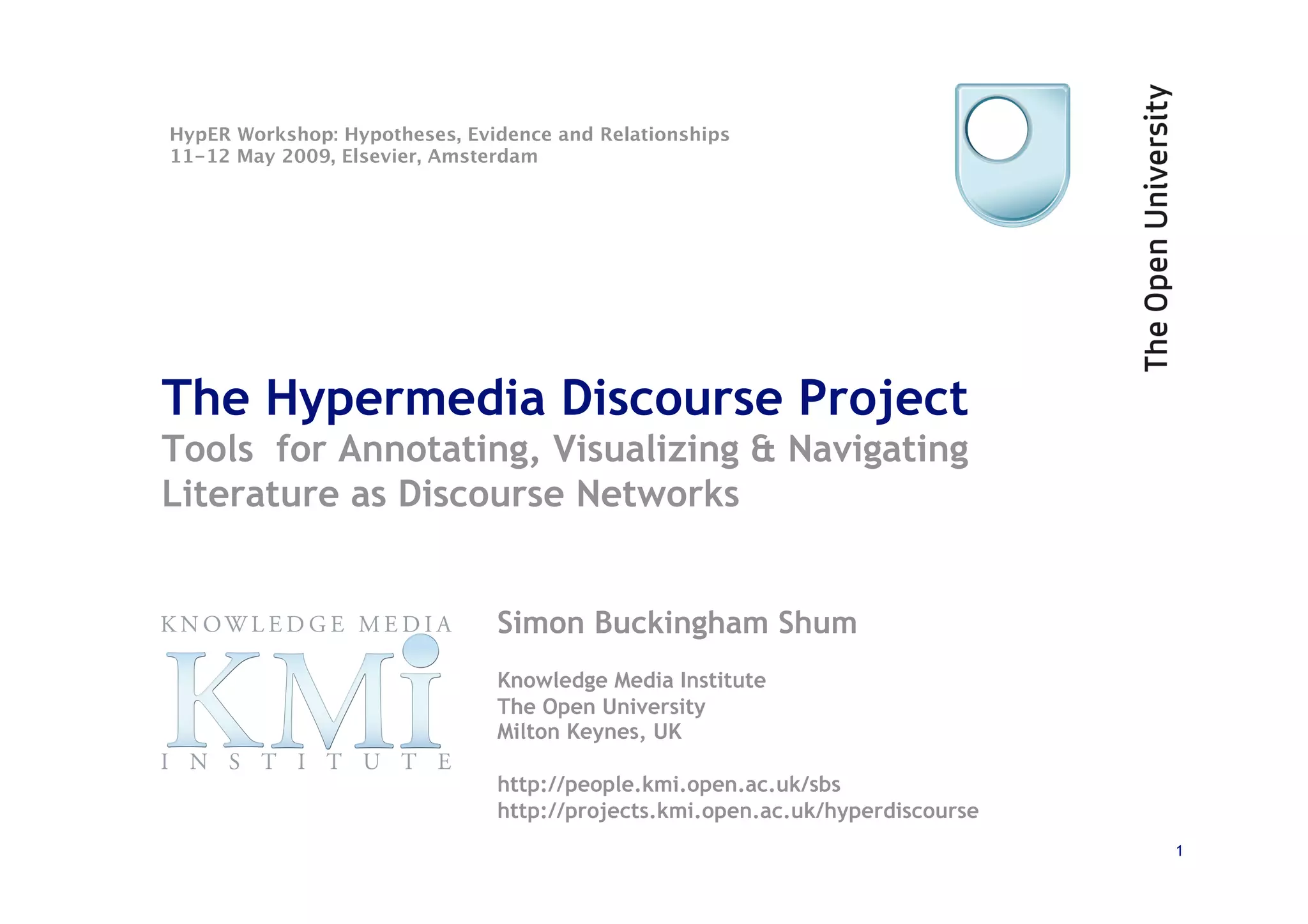 The document discusses the evolution of scientific publishing and the potential transition from traditional prose papers to a new infrastructure that utilizes the social and semantic web to create a network of claims and arguments. It emphasizes the importance of tools for annotating, visualizing, and navigating scientific literature and identifies key questions the next generation scientific infrastructure should address, like evidence and consistency of claims. Several modeling schemes and user interaction design strategies, including user studies, are also outlined as part of developing a collaborative discourse around scientific knowledge.