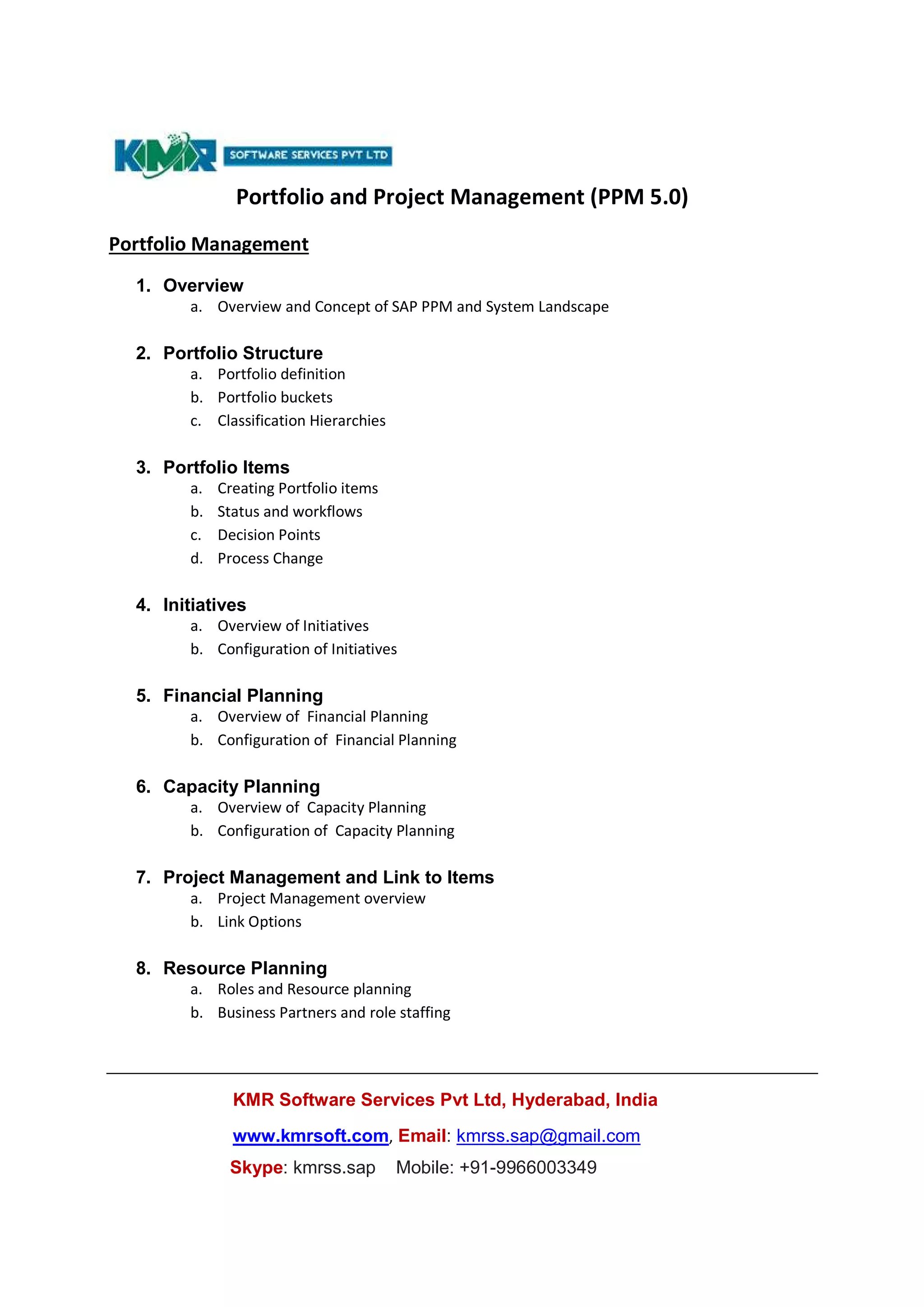 The document outlines the topics that will be covered in a training on SAP Portfolio and Project Management (PPM) software. The training will cover Portfolio Management topics like portfolio structure, portfolio items, initiatives, financial planning, capacity planning, resource planning, and reporting. It will also cover Project Management topics like project structures, planning, execution, evaluations, integration with other applications, and additional functions like project versions and multi-project management. KMR Software Services Pvt Ltd based in Hyderabad, India will provide the training.