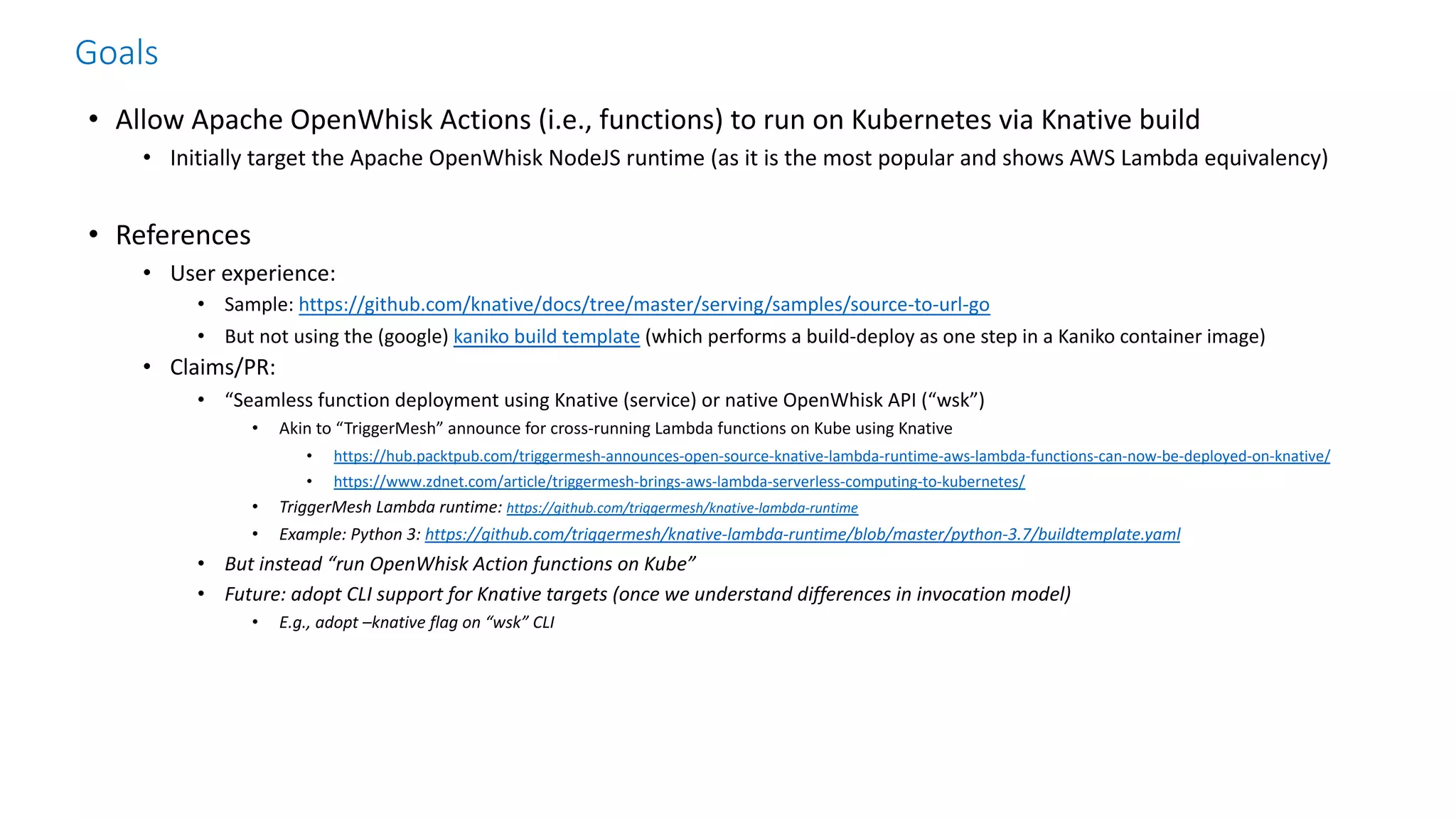 The document discusses plans to allow Apache OpenWhisk functions to be built and run on Knative Serving. It aims to initially target the Apache OpenWhisk NodeJS runtime. The goals are to provide a seamless deployment experience for functions using either the Knative or OpenWhisk APIs. TriggerMesh's approach to modifying the Knative BuildTemplate to support their own runtimes is also examined.