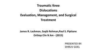 Traumatic knee dislocations are rare injuries that require careful evaluation and management. According to the document, knee dislocations often result from high-energy injuries like motor vehicle collisions or falls. A thorough examination is needed to assess vascular and neurological status. Imaging can identify associated fractures. While some stable injuries may be treated non-operatively, unstable injuries or those with ligament disruption typically require surgical reconstruction. Complications may include neurovascular injuries, infections, and long-term issues like osteoarthritis. Early surgical intervention within 3 weeks of injury may lead to better outcomes compared to delayed treatment.