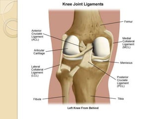 The knee joint is the largest synovial joint in the body. It is composed of three bones: the femur, tibia, and patella. The knee joint has two articulations: the tibiofemoral joint between the femur and tibia, and the patellofemoral joint between the patella and femur. The knee joint is a compound synovial joint, with the tibiofemoral joint being a hinge type and the patellofemoral joint being a plane type. The knee joint is surrounded by ligaments such as the ACL and PCL, and contains a synovial fluid within its capsule. It also contains menisci that act as cushions and increase stability.