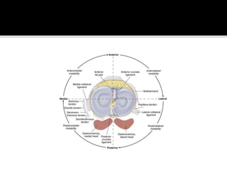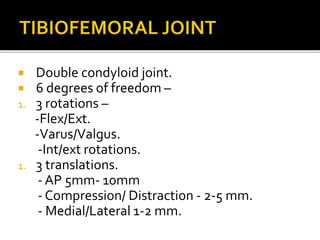 The document elaborates on the knee joint, describing its double condyloid structure with six degrees of freedom, and the roles of ligaments, menisci, and muscles in facilitating movement and stability. It details the mechanics of knee flexion and extension, including the movements of the femur and tibia along with the patellar dynamics during these actions. The document also addresses the implications of patellar position and tendon length on joint function and potential instability.