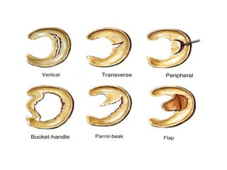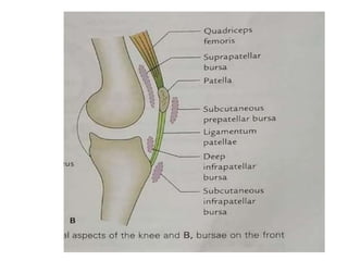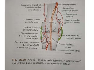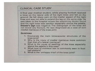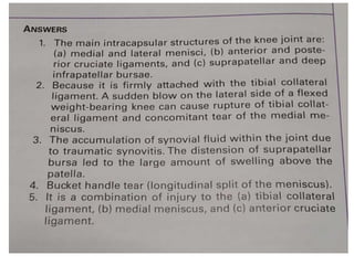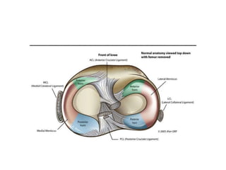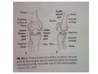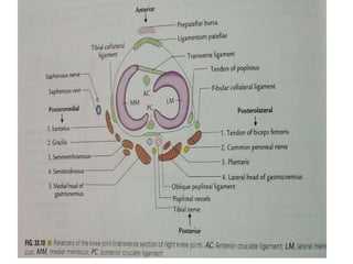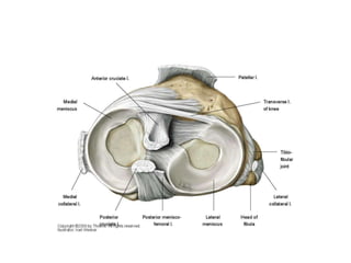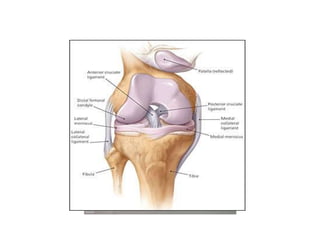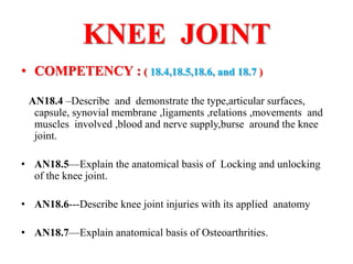 The knee joint is the largest and most complex joint in the body, formed by the fusion of three joints. It contains articular surfaces on the femur, patella, and tibia. Stability is provided by muscles, collateral ligaments, and cruciate ligaments. The knee allows for flexion, extension, and medial/lateral rotation. Locking and unlocking during walking is enabled by the quadriceps and popliteus muscles respectively. Injuries like meniscal tears and dislocations are clinically relevant.