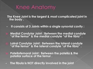 The knee joint is the largest and most complicated joint in the body. It consists of three joints within a single synovial cavity: the medial and lateral condylar joints between the femur and tibia, and the patellofemoral joint between the patella and femur. The knee joint is supported by ligaments such as the ACL and PCL, as well as menisci. Osteoarthritis is a common condition affecting the knee joint, characterized by the progressive destruction of articular cartilage and new bone growth, leading to pain and stiffness. It results from an imbalance between mechanical stress on the cartilage and its ability to withstand that stress.