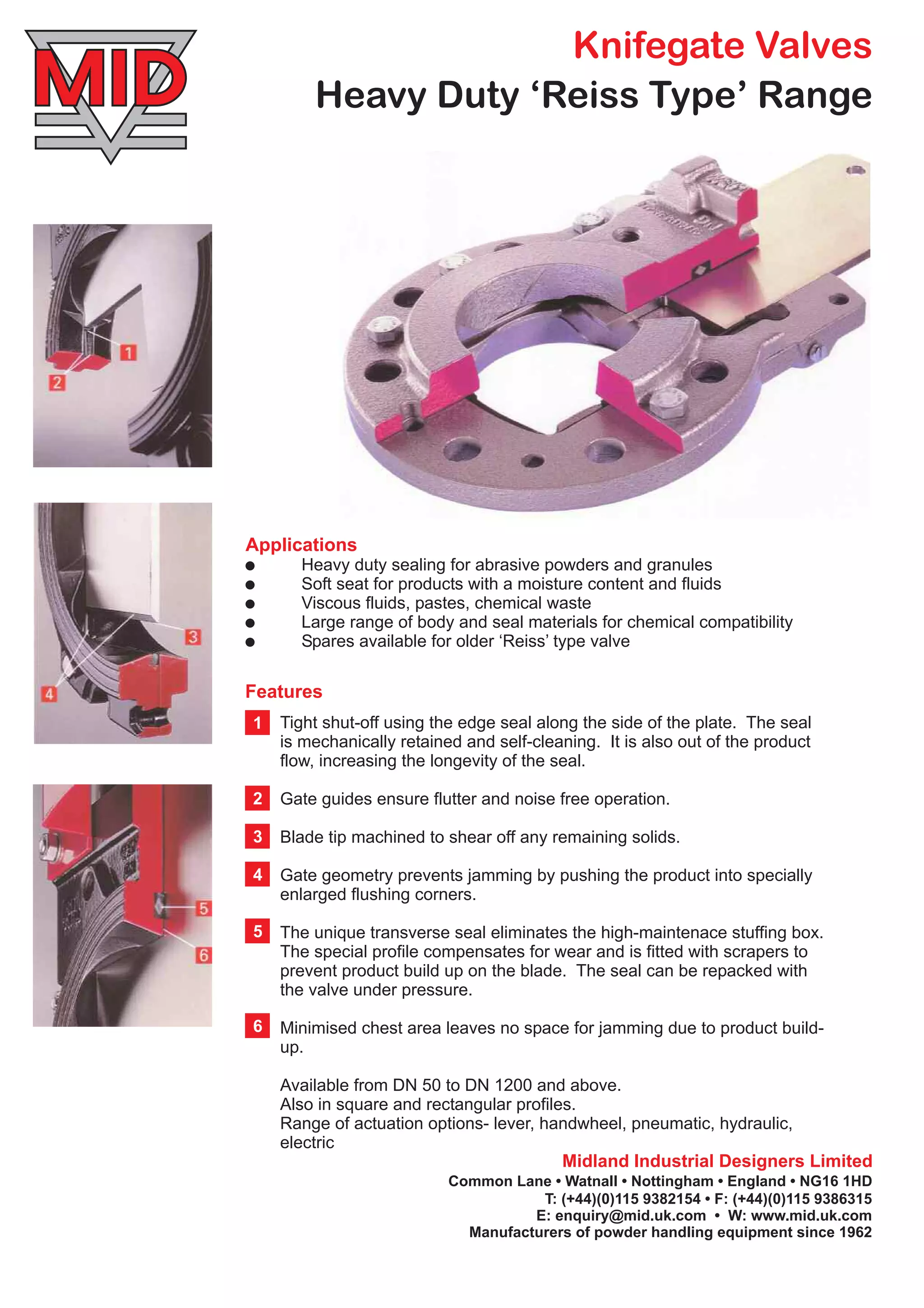 Knifegate valves are designed for use with abrasive powders, granules, viscous fluids, and pastes. They feature a self-cleaning edge seal along the side of the plate to provide tight shut-off. Gate guides ensure flutter-free operation and the blade tip is machined to shear off remaining solids. A range of body and seal materials provide chemical compatibility and sizes are available from 50 to 1200mm.