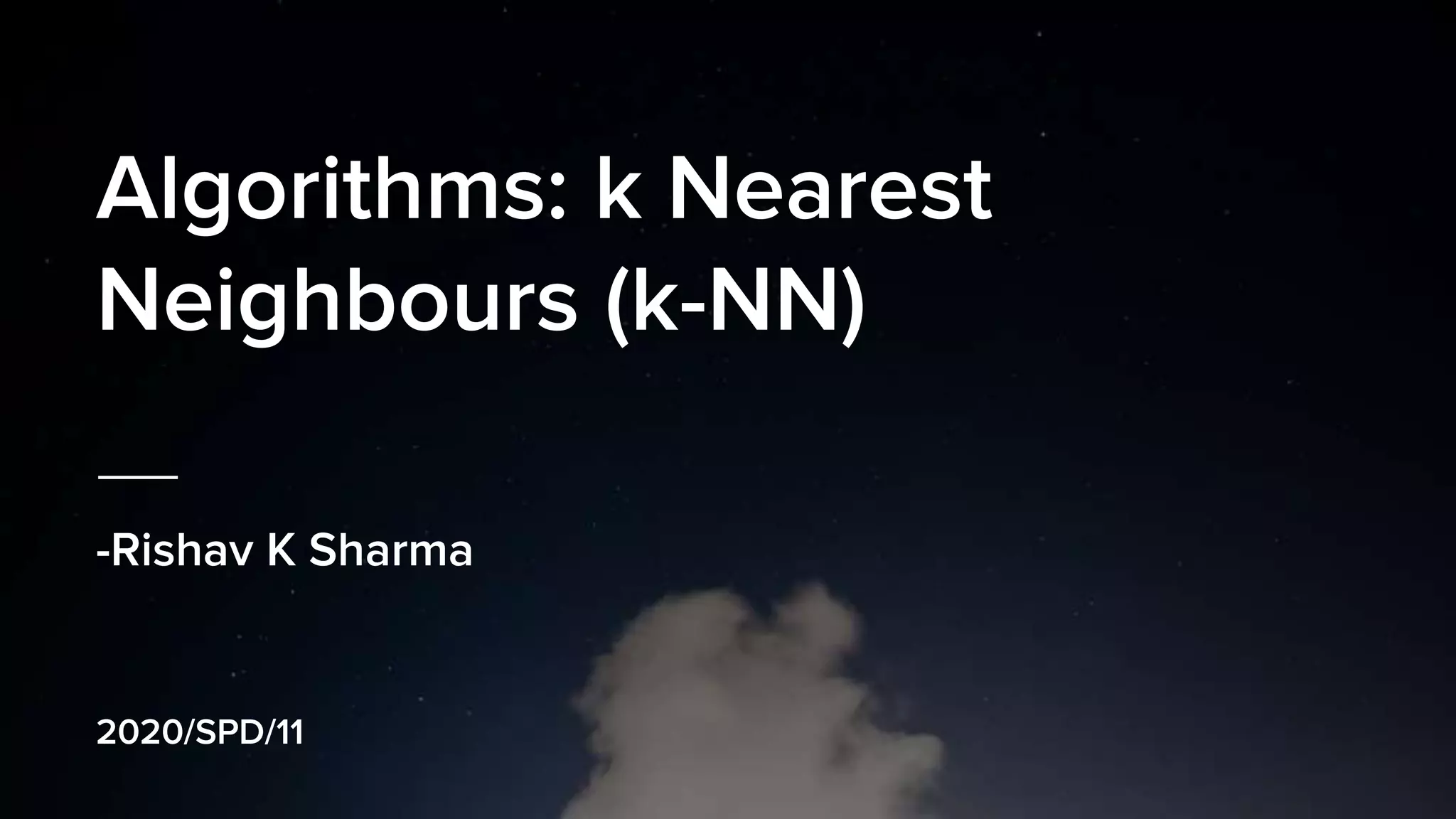 k-Nearest Neighbors (k-NN) is a simple machine learning algorithm that classifies new data points based on their similarity to existing data points. It stores all available data and classifies new data based on a distance function measurement to find the k nearest neighbors. k-NN is a non-parametric lazy learning algorithm that is widely used for classification and pattern recognition problems. It performs well when there is a large amount of sample data but can be slow and the choice of k can impact performance.