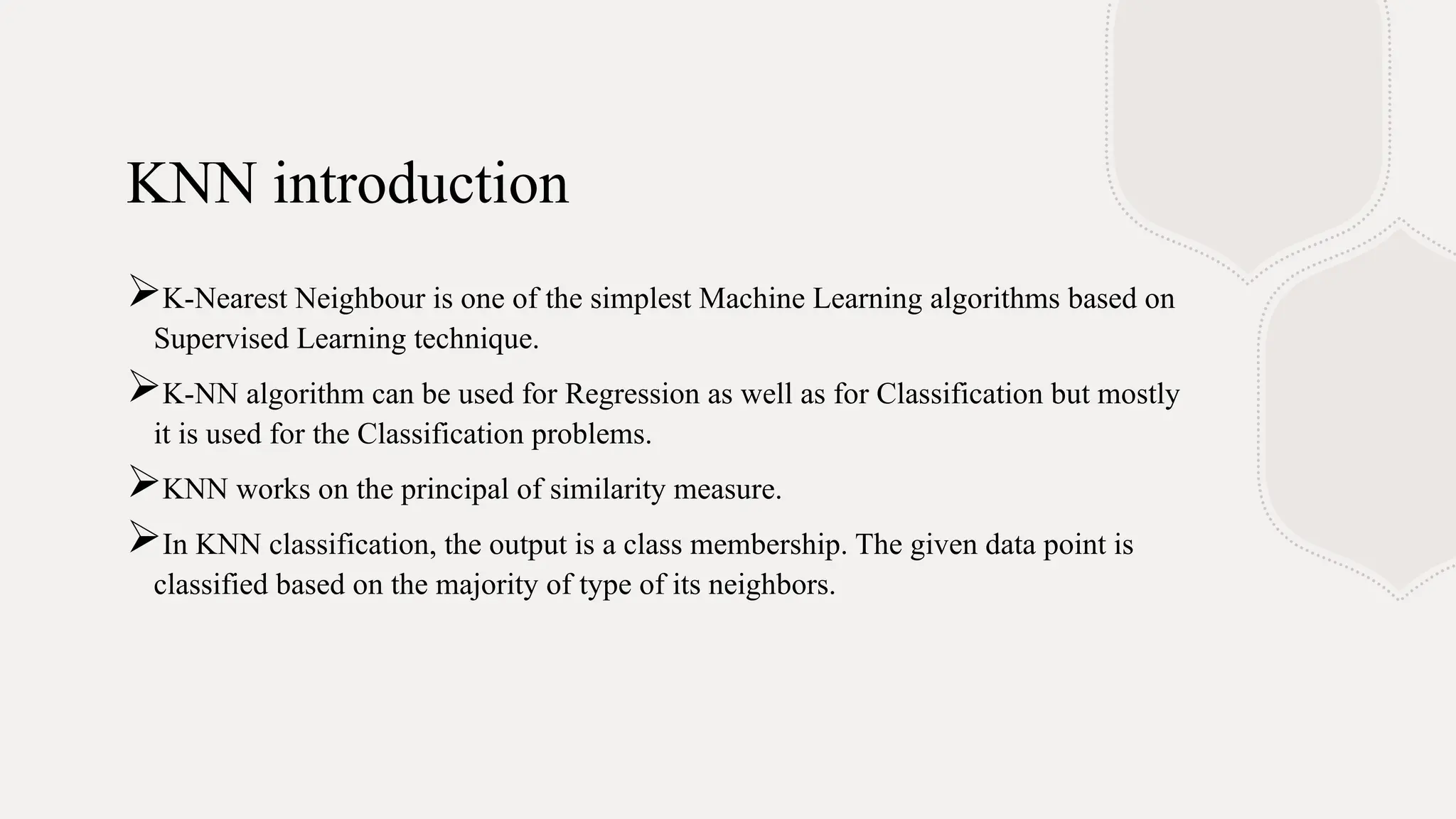 The k-nearest neighbors (k-NN) algorithm is a straightforward machine learning method primarily used for classification tasks, relying on similarity measures to classify data points based on their nearest neighbors. It is a lazy and non-parametric learning algorithm that does not require a training phase but instead uses all training instances during testing, making it efficient for certain tasks but computationally expensive with large datasets. While k-NN has advantages like simplicity and versatility, it also has drawbacks such as high memory requirements and sensitivity to high dimensionality.